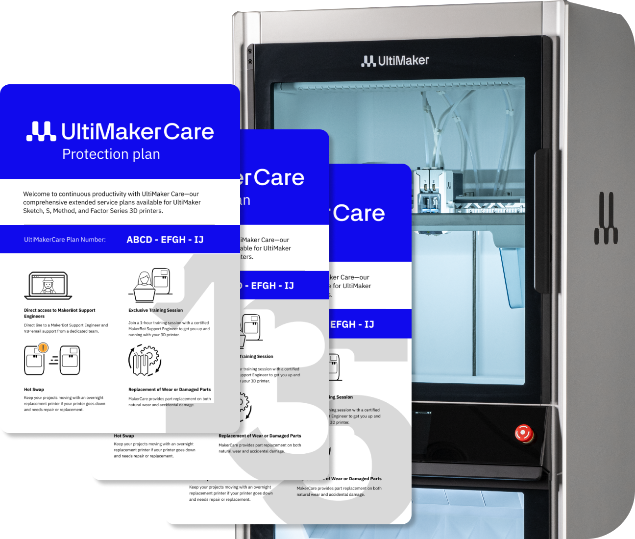 For added convenience, UltiMaker Care can be purchased anytime within your printer's warranty period and backdated to the original purchase date, allowing you to access extended coverage without interruption.